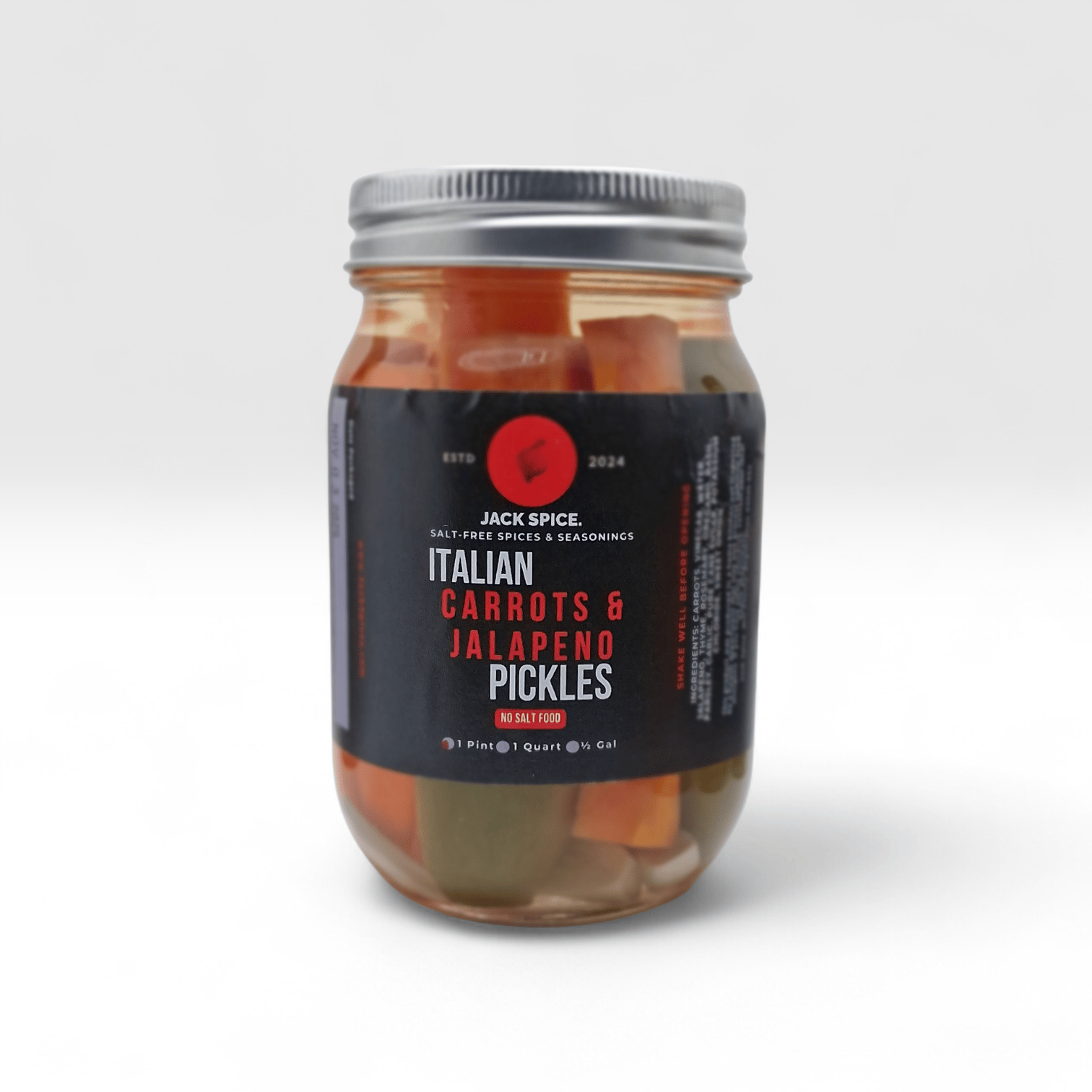 Crunchy carrots, spicy jalapeños, and Italian herbs come together in a bright, tangy pickle with a satisfying heat.