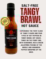 Experience the fiery clash of tangy flavor and four types of hot peppers in Tangy Brawl Hot Sauce. Tangy on the front end, with serranos, red & green jalapeños picking up the middle and habanero pepper swooping up the back.